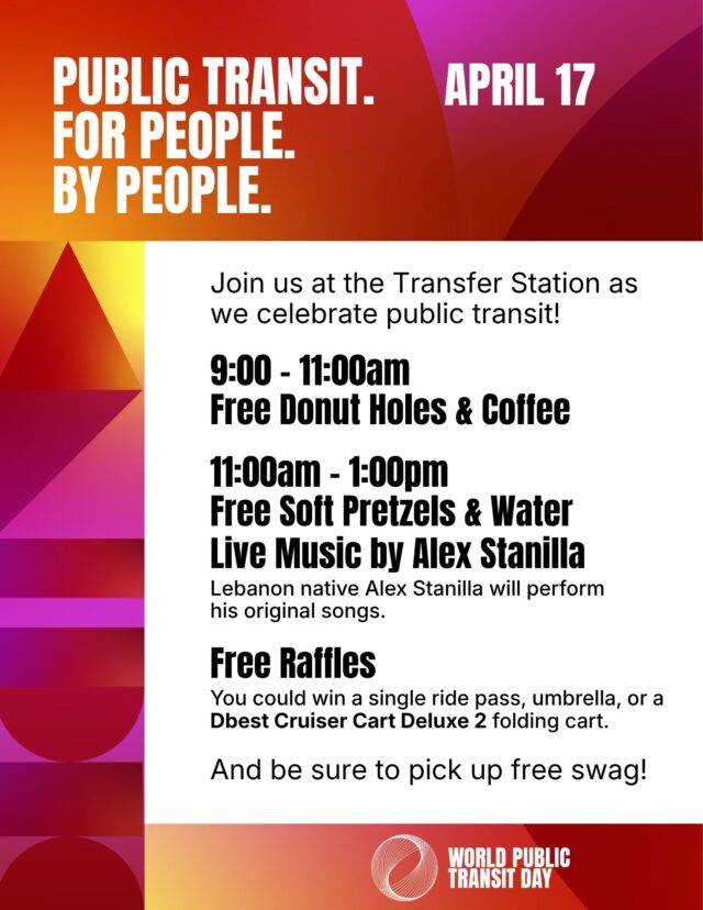 Home / News / News & Events / Join Lebanon Transit for World Public Transit Day April 17 Join Lebanon Transit for World Public Transit Day April 17 Categorized in: News & Events Posted on: April 6, 2026 Last updated on: April 6, 2026 Written by: Mike Ritter Skip back to main navigation