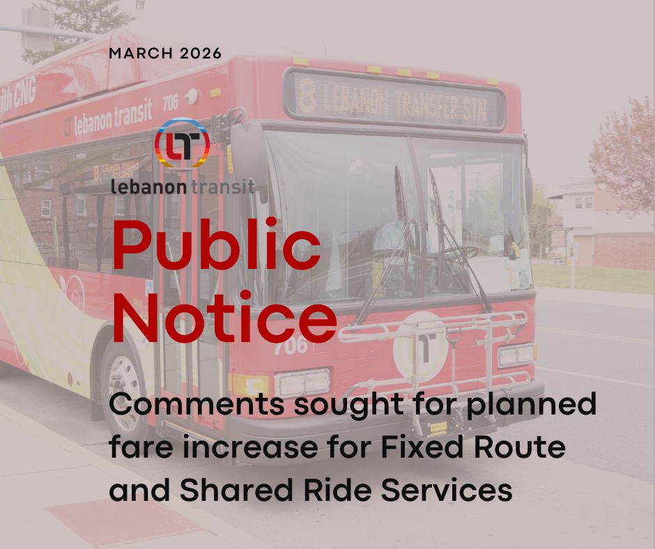 Lebanon Transit seeks public comment concerning a planned fare increase for Fixed Route and Shared Ride Services.