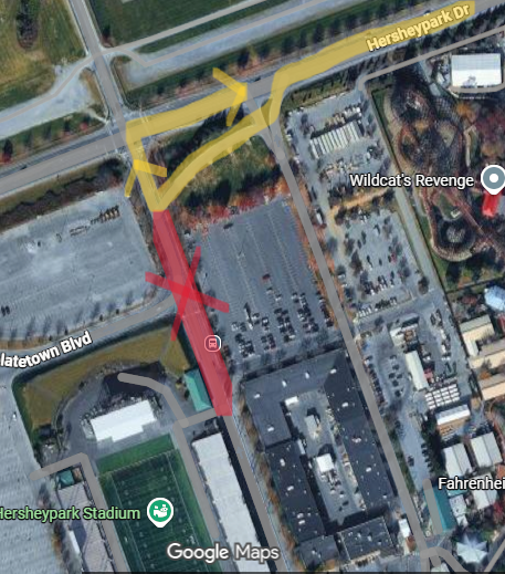 Bus will not be able to pick up and drop off in front of Hersheypark Employee entrance. Anyone needing the bus at Hersheypark will need to walk towards Hersheypark Drive. There is a small service road before Hersheypark Drive. That is where the bus will be picking up and dropping off.